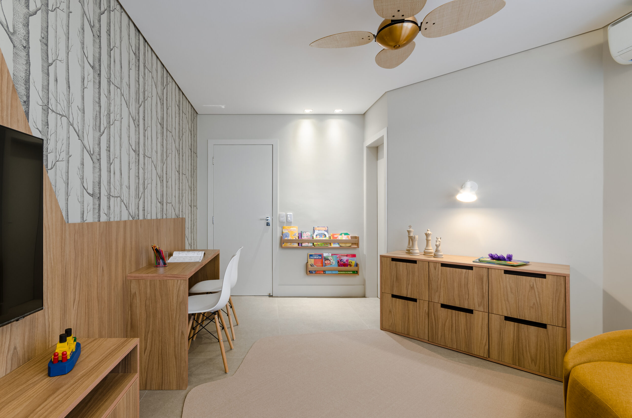 Entre os ambientes, a sala de estar e a de TV se destacam como pontos de encontro e permanência. O mobiliário sob medida combina ergonomia, proporção e acabamento primoroso, incorporando nichos e áreas de armazenamento que mantêm o espaço organizado e agradável. “O mobiliário planejado foi essencial para garantir um design funcional e integrado à estética do projeto”, pontua a arquiteta. O projeto também trouxe inovações discretas, mas impactantes, como a integração da iluminação aos móveis, valorizando texturas e criando um conforto visual perceptível no uso cotidiano. “A sala de TV e estar se tornou nosso espaço favorito, mas, na verdade, todos os ambientes ficaram excelentes. Foi um processo tranquilo, no qual a equipe da Costa Flores demonstrou atenção e cuidado em cada detalhe, entregando exatamente o que esperávamos”, conta o cliente.