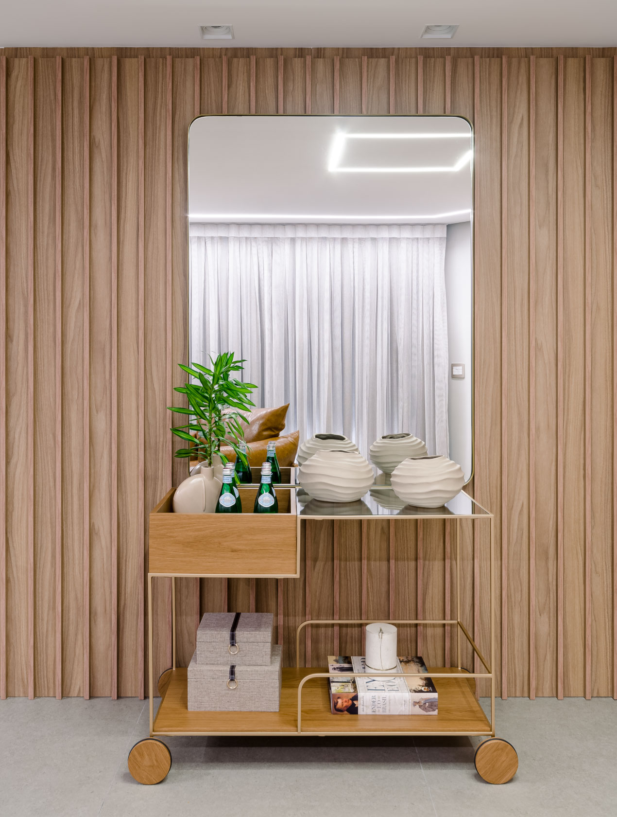 Um dos maiores desafios, segundo a arquiteta, foi encontrar o equilíbrio entre modernidade e aconchego, preservando a personalidade do lar. “A solução veio por meio de uma curadoria cuidadosa de materiais, buscando harmonia e evitando excessos, o que resultou em um espaço elegante e acolhedor”, afirma Mariana. A integração entre volumes e a distribuição estratégica de luz realçam a beleza dos acabamentos e ampliam a sensação de espaço.