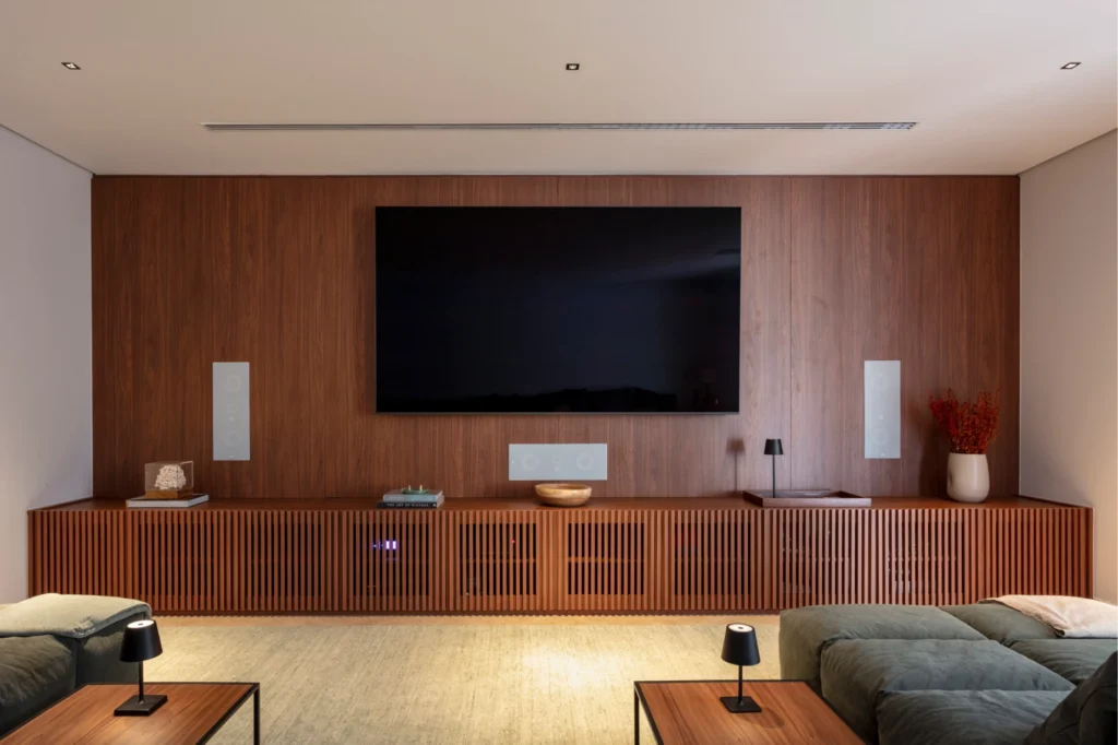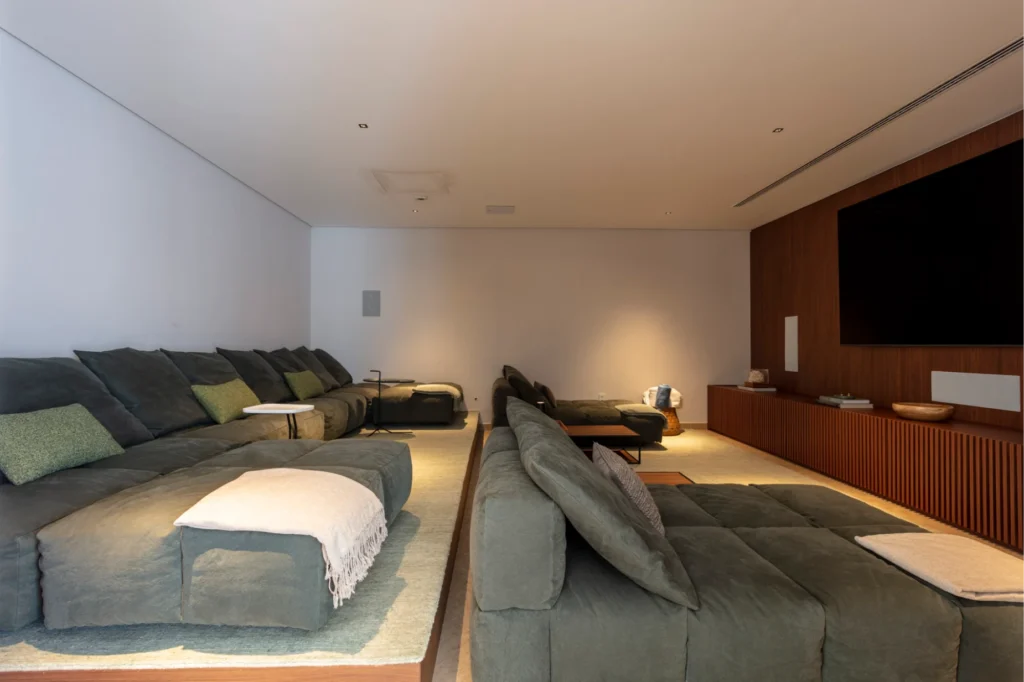 Assinado pelo escritório Sala 03 Arquitetura, o projeto recebeu não apenas o móvel para os aparelhos eletrônicos, mas também o tablado elevado para os sofás, garantindo a experiência completa de uma sala de cinema.