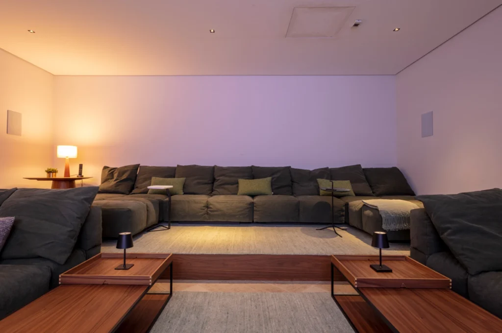Uma casa de veraneio pensada para uma família que adora receber e vive com a casa cheia. E para tornar esses momentos ainda mais especiais, nada melhor do que ter um cinema particular para aproveitar filmes e séries com todo conforto.