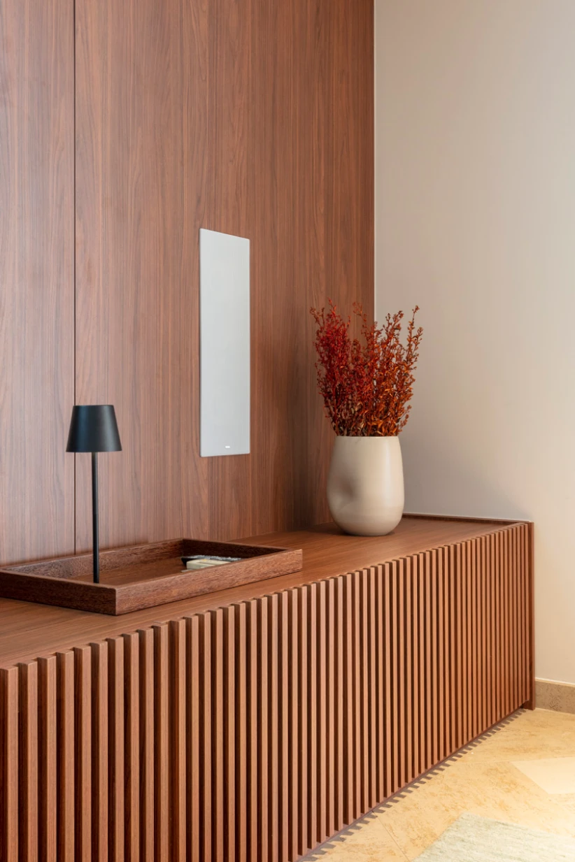 Assinado pelo escritório Sala 03 Arquitetura, o projeto recebeu não apenas o móvel para os aparelhos eletrônicos, mas também o tablado elevado para os sofás, garantindo a experiência completa de uma sala de cinema.