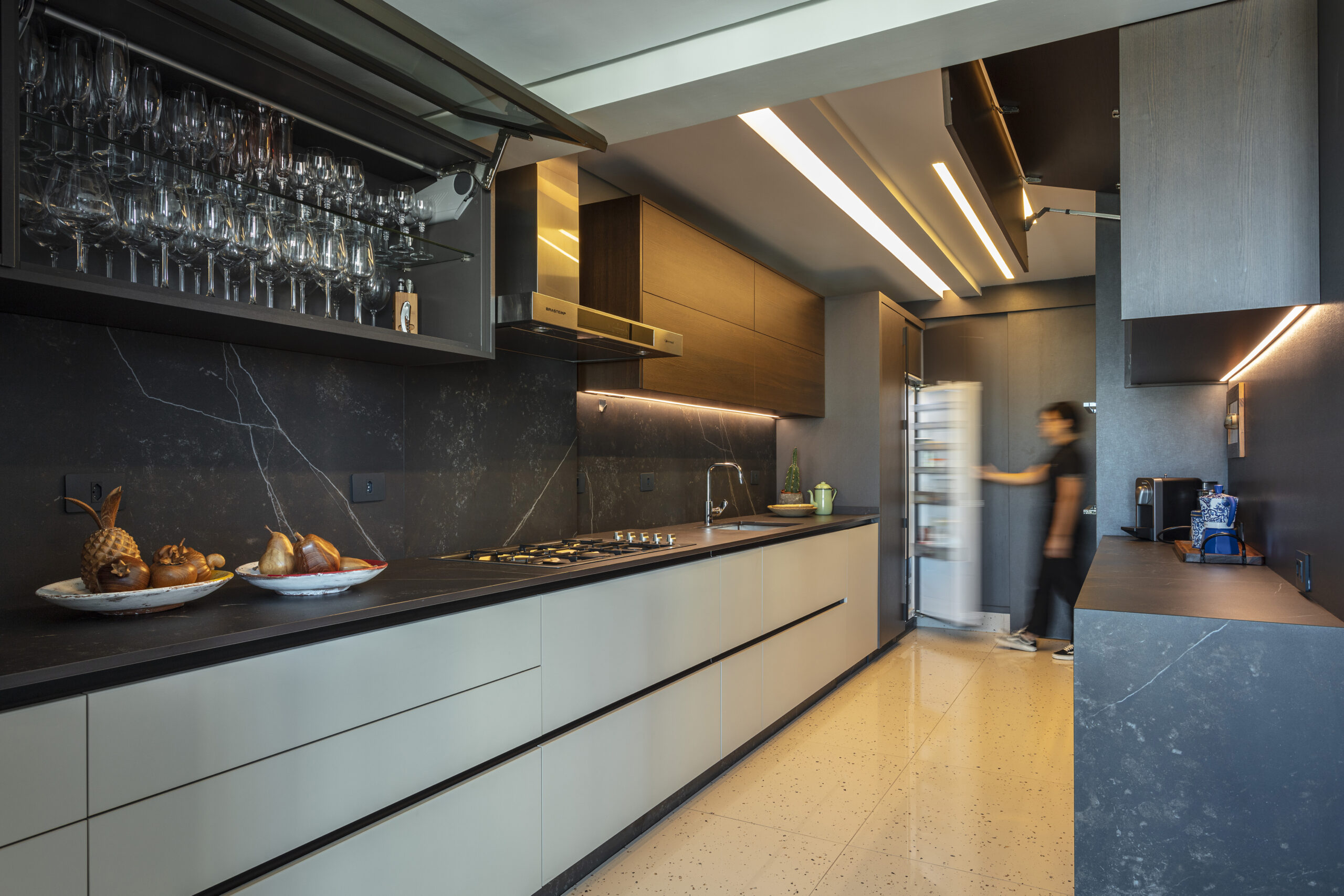 Cada ambiente foi desenhado para valorizar o uso cotidiano, com soluções que aliam estética e eficiência. A cozinha, por exemplo, tornou-se o coração da casa. O amplo balcão transformou a relação com o espaço e trouxe prazer às tarefas diárias. “É minha queridinha. Ter esse balcão fez toda a diferença na hora de preparar minhas receitas”, conta. Já a sala ganhou um ar de elegância descontraída, ideal para receber com charme e conforto.