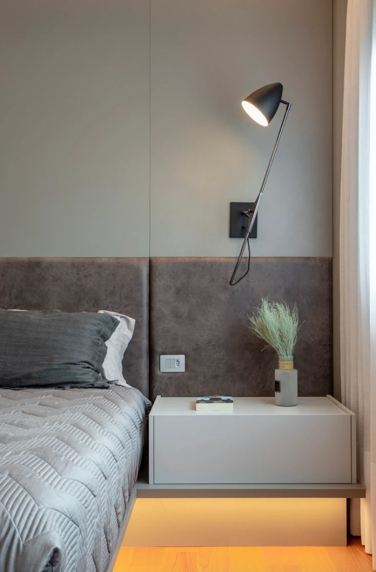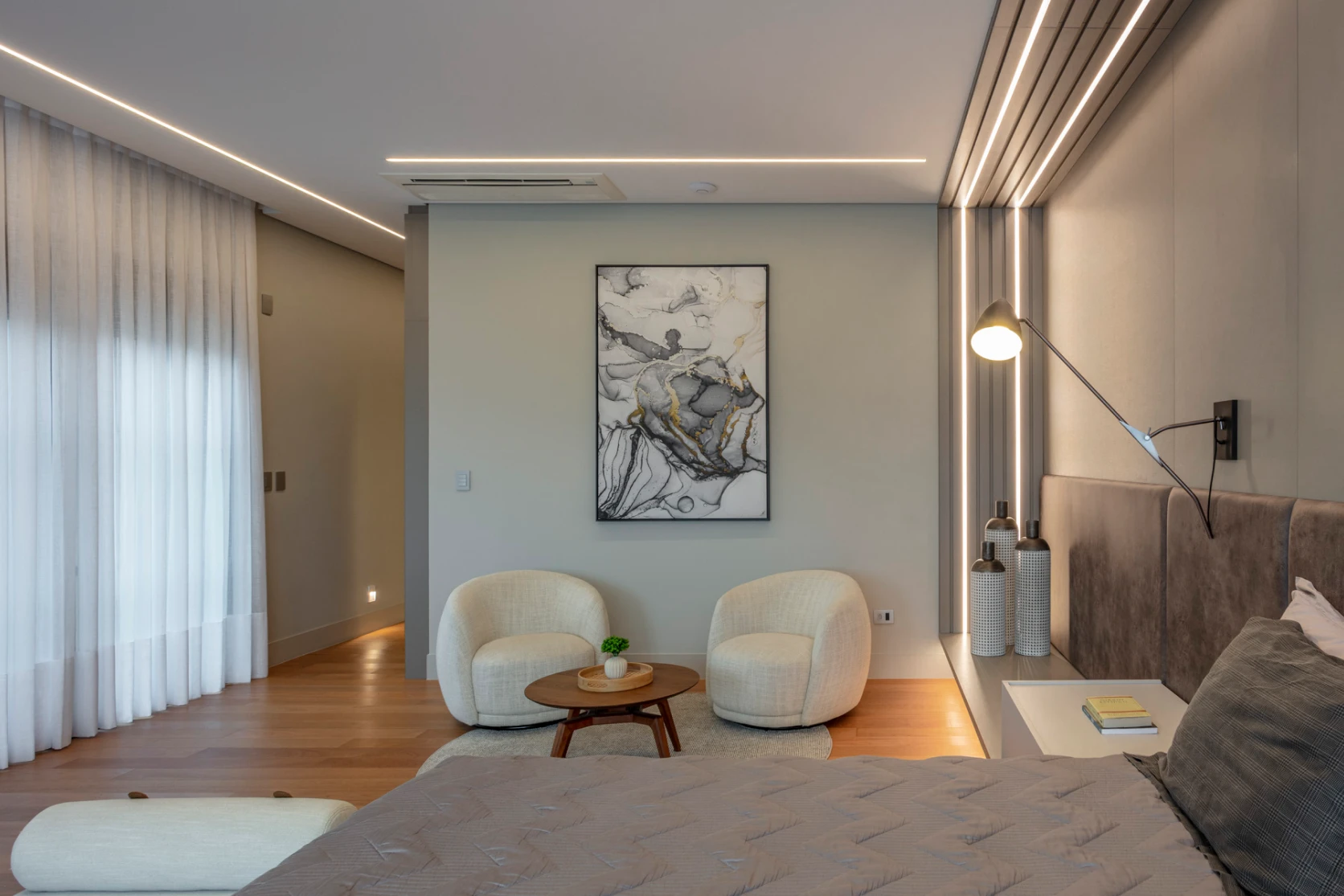 Cada detalhe desse dormitório foi pensado para transformar o descanso em experiência. A cama feita sob medida — com desenho leve e imponente — parece flutuar no ambiente, criando uma sensação de amplitude e sofisticação.