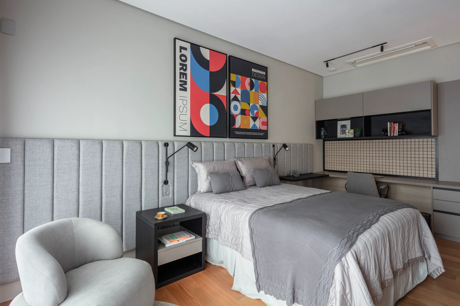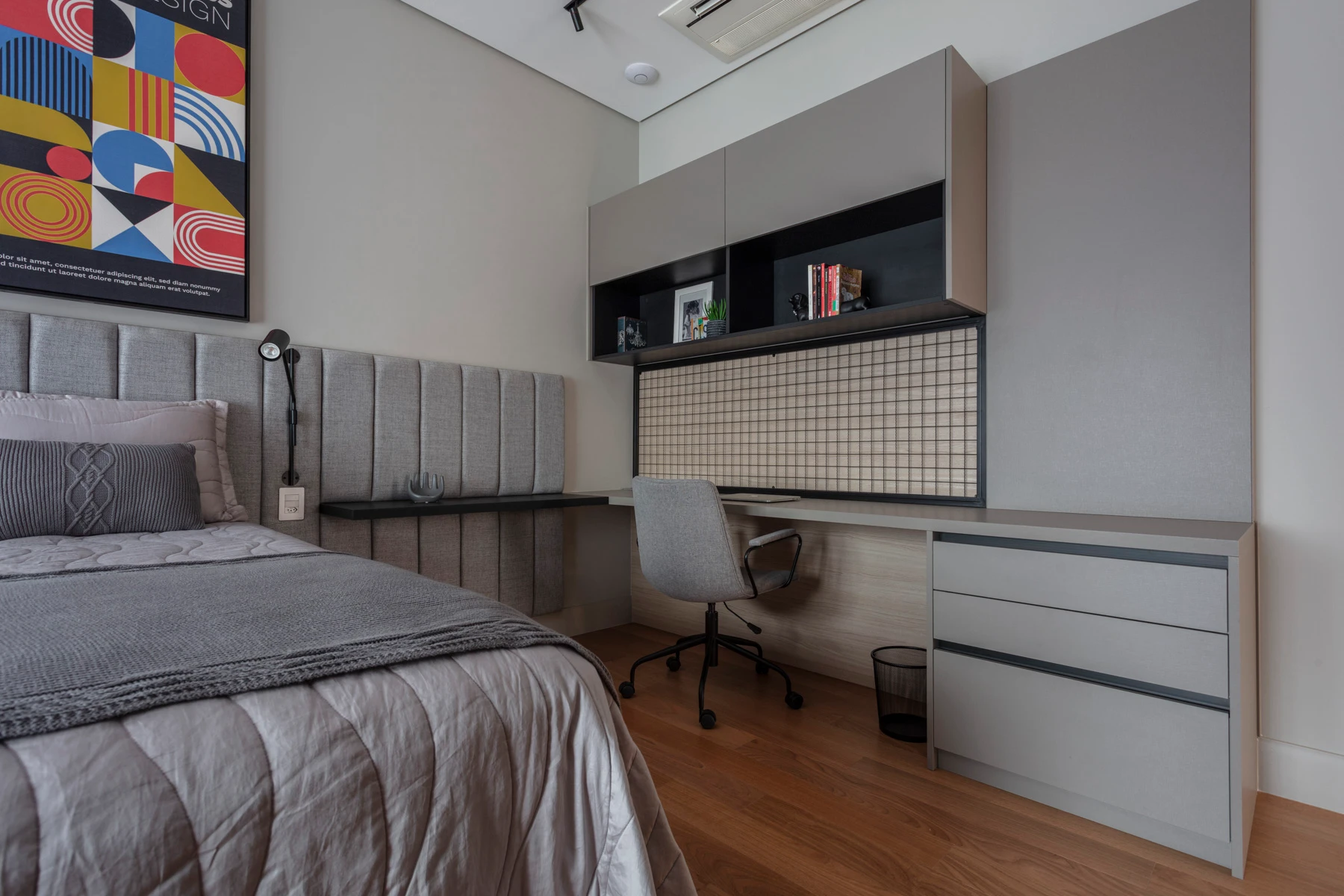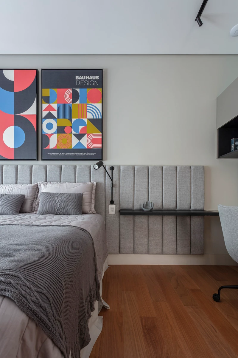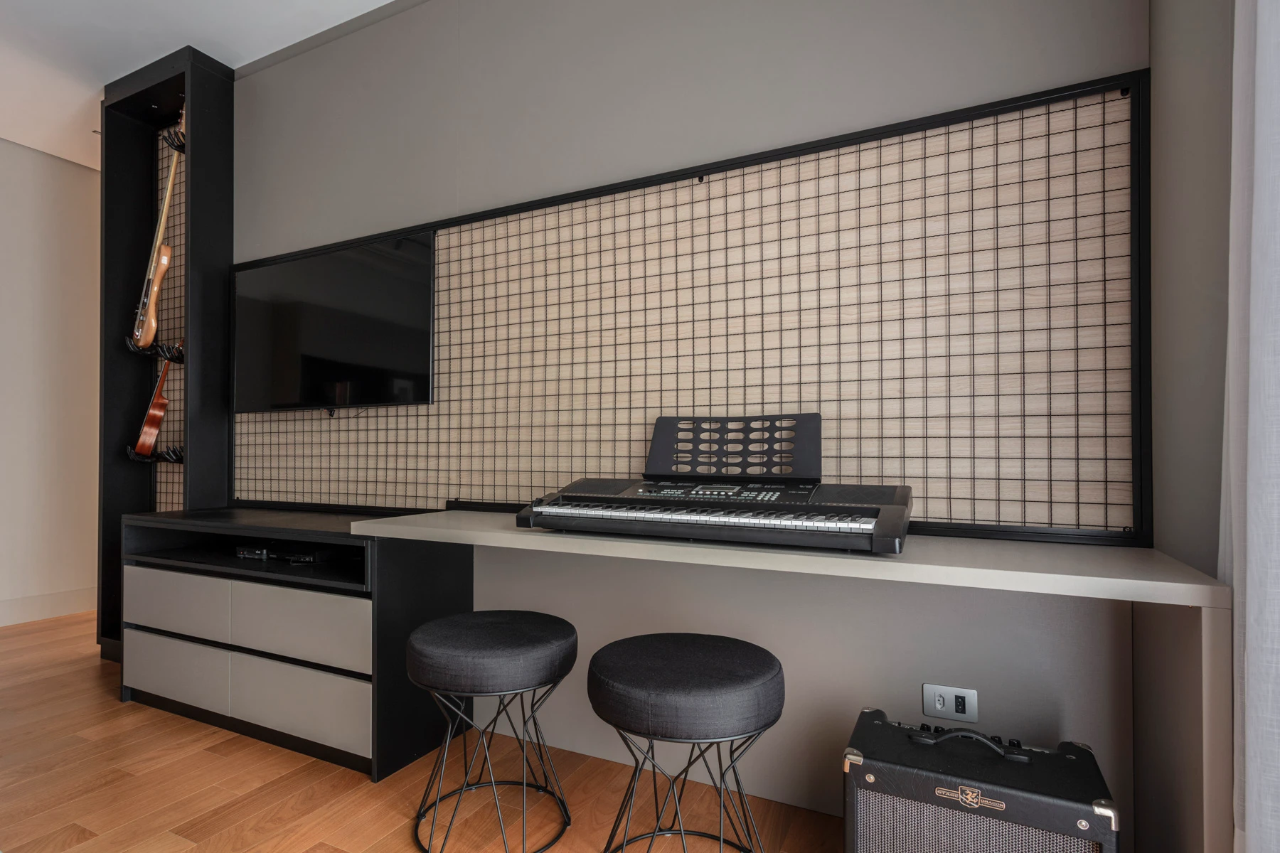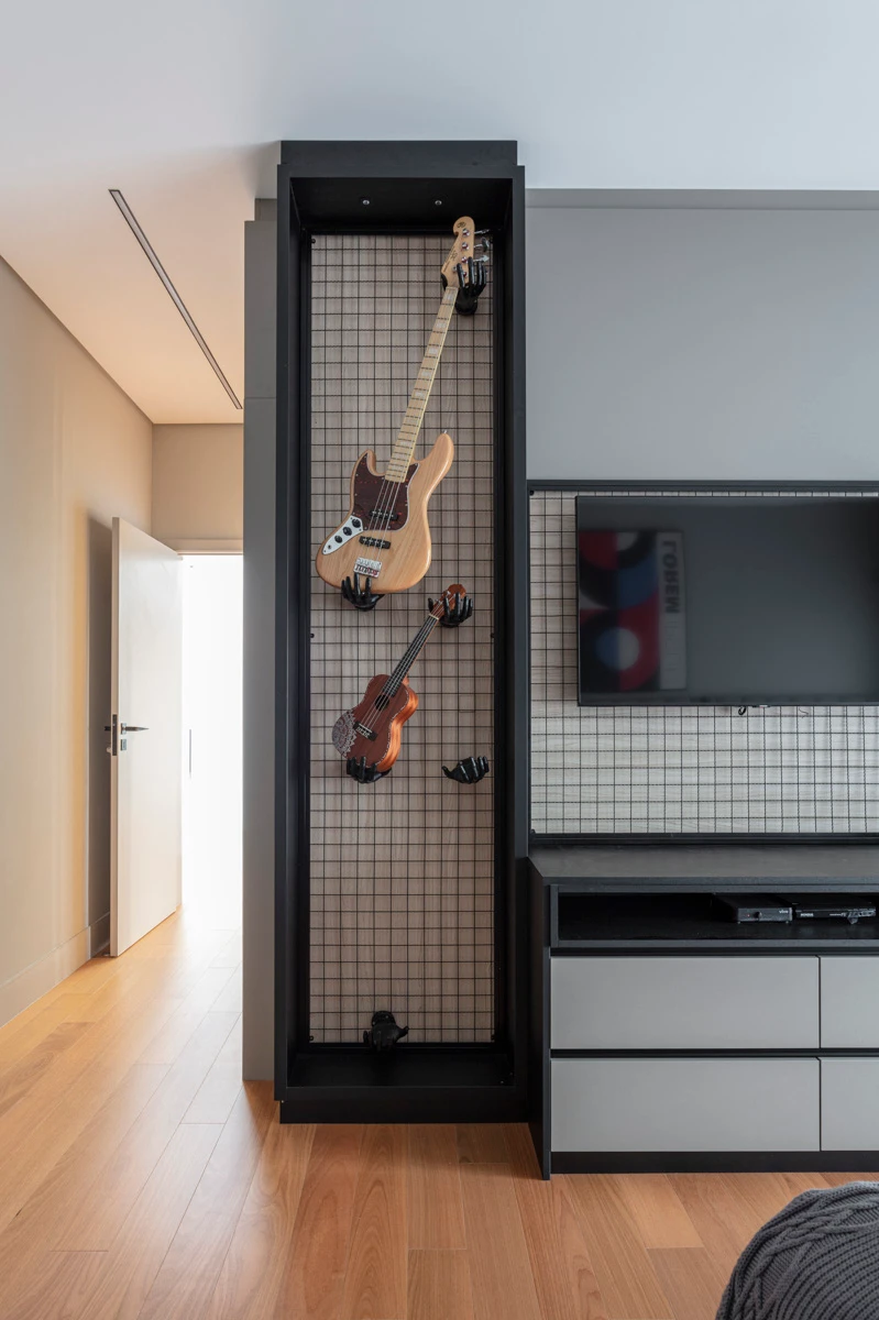 Um dormitório criado para refletir a personalidade musical da jovem moradora. O teclado, o contrabaixo e o ukulelê ganharam lugar de destaque em móveis sob medida, transformando seus instrumentos em parte da decoração. A cabeceira estofada traz aconchego, enquanto a escrivaninha organiza o espaço de estudos.