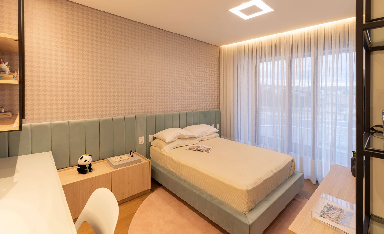 Dormitório da filha — Casa Luz, por Sonnemüller. Uma suíte clean com papel de parede pied-de-poule, penteadeira charmosa e cabeceira estofada em veludo azul claro. Na parede da TV, o painel ripado em padrão liso e o móvel baixo com frentes delicadas trazem leveza ao espaço, enquanto a estante em metalon organiza bolsas e objetos pessoais com personalidade.