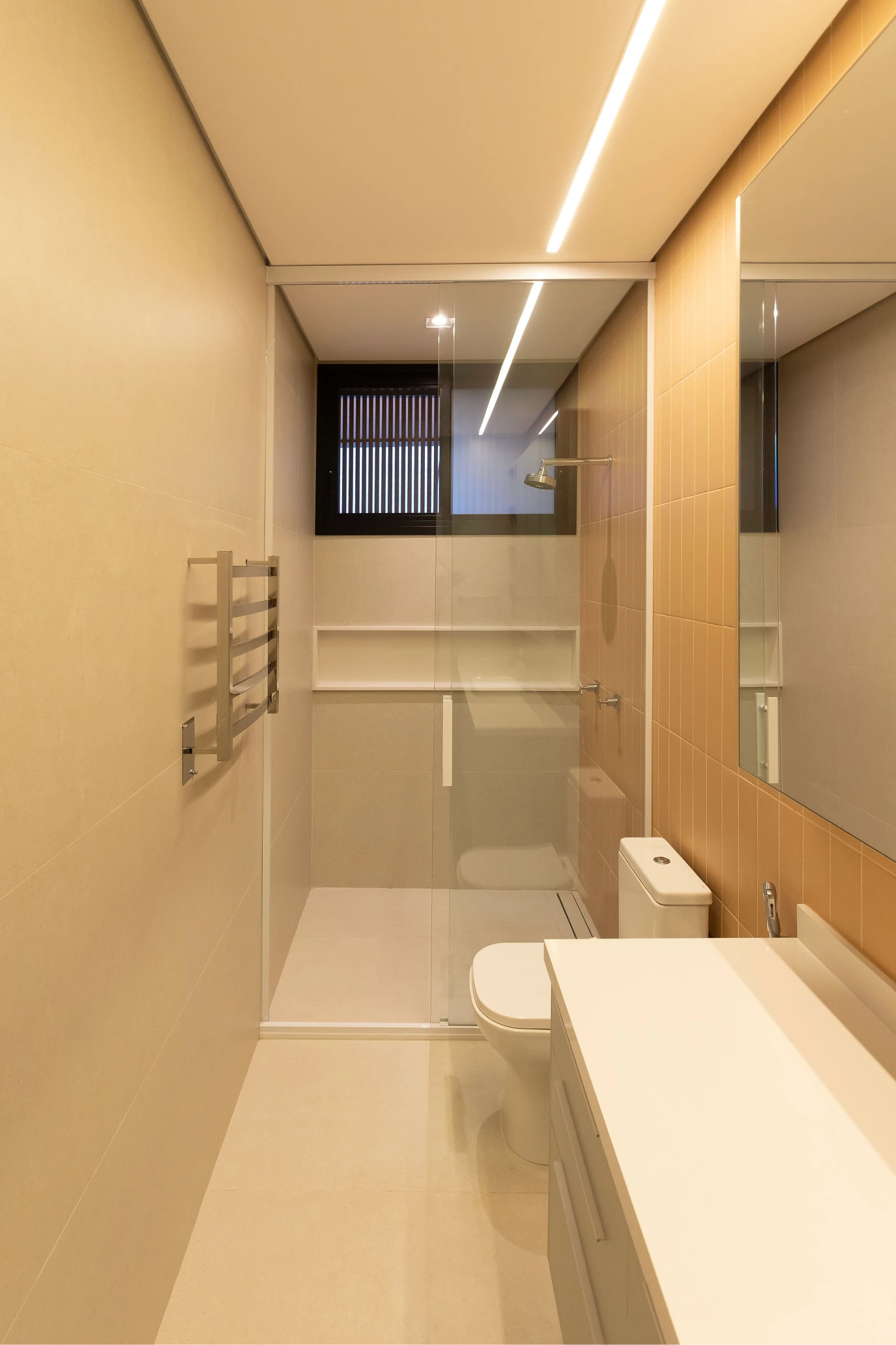 O closet sem portas complementa o ambiente, trazendo praticidade ao dia a dia: roupas sempre visíveis, combinações mais rápidas e uma rotina muito mais funcional.