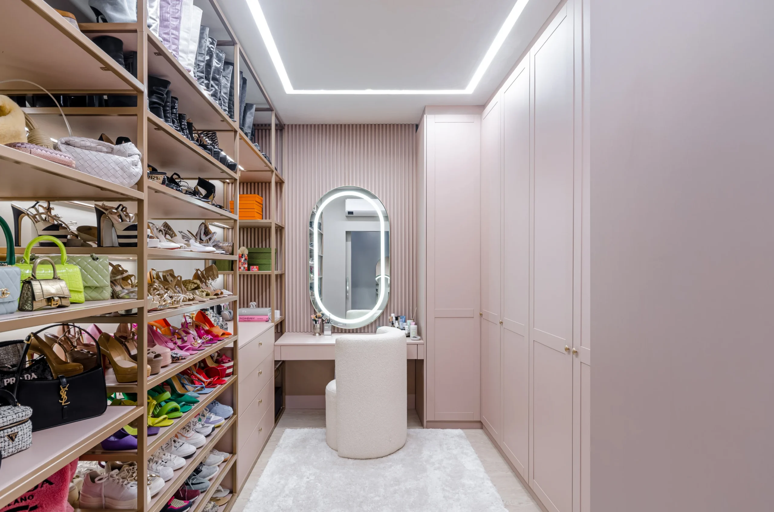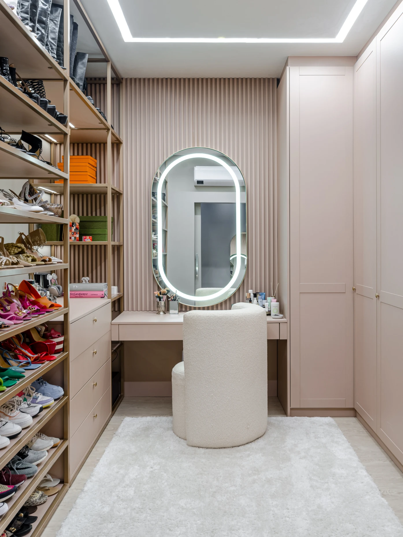 A elegância discreta marca cada escolha do projeto assinado pela arquiteta Denise Rola. O closet, desenhado sob medida, traduz o equilíbrio perfeito entre funcionalidade e estética. Pensado para atender às necessidades específicas da cliente, cada detalhe foi minuciosamente planejado para garantir organização e conforto. “Cada espaço foi pensado para ser funcional no dia a dia, mas sem abrir mão da estética. O resultado é um ambiente personalizado, prático e com identidade”, destaca Denise.
