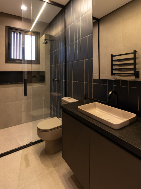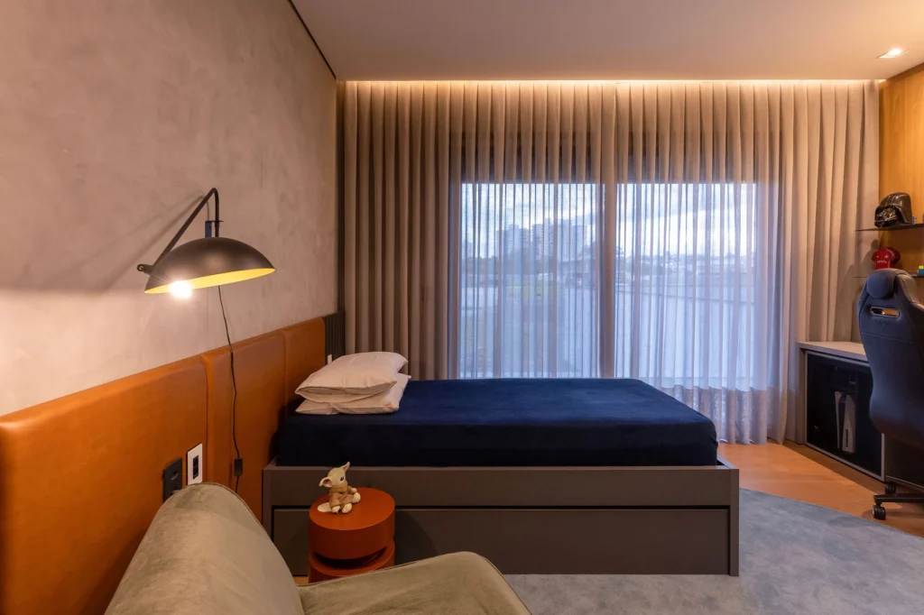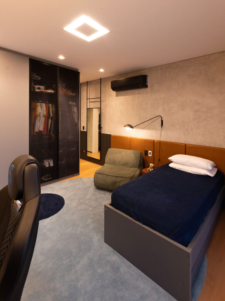 O ambiente combina paredes em cimento queimado com uma cabeceira que une ripas e parte estofada, criando textura e conforto. A cama com bicama, feita sob medida por nós, otimiza o espaço com funcionalidade. O painel em madeira aquece o quarto, enquanto a escrivaninha garante um canto ideal para estudos. No roupeiro, as portas Ágata adicionam personalidade e um toque moderno ao projeto.