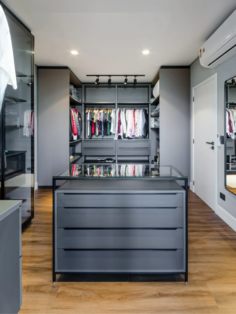 Um dormitório marcado pela leveza do minimalismo. A cabeceira ripada, alinhada à altura da porta, cria um visual contínuo e elegante. No closet, a escolha foi o modelo sem portas — perfeito para ambientes dedicados a isso — deixando todas as peças visíveis, facilitando o dia a dia e até a hora de escolher ou comprar um novo look.