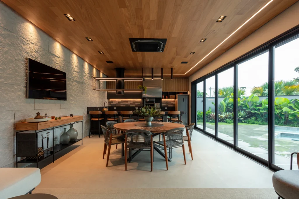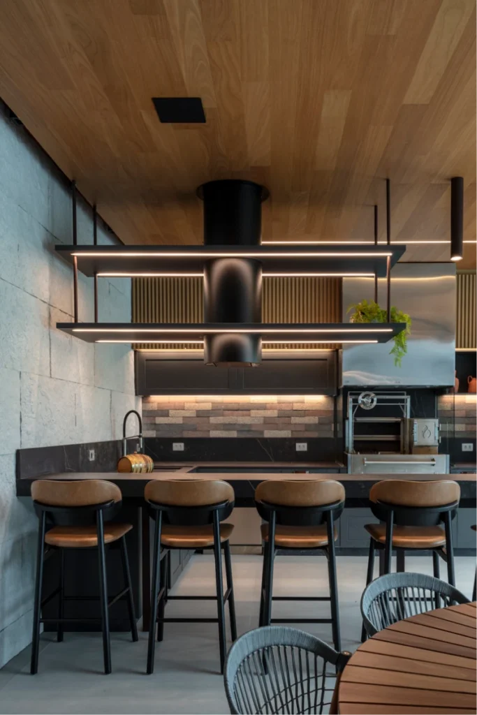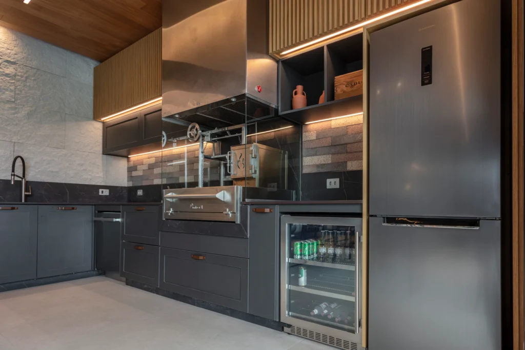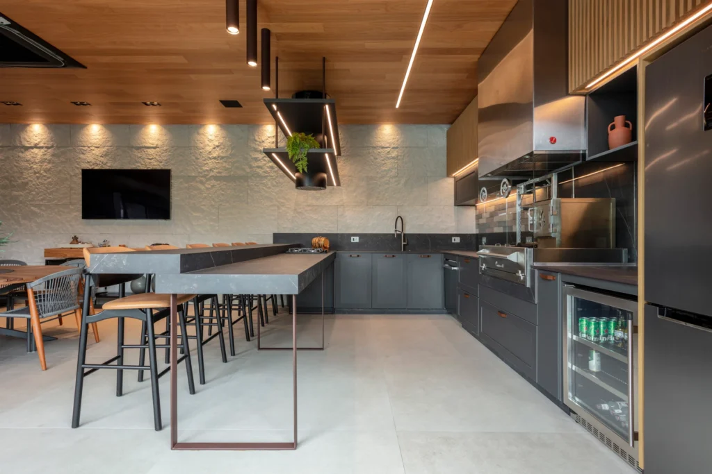 O espaço gourmet, integrado à cozinha e à área externa, foi projetado para criar continuidade visual e funcionalidade no dia a dia. A designer de interiores Edilena Lara propôs portas almofadadas em tom de cinza, combinadas ao puxador Nord no acabamento Vecchio Metallo — escolha que adiciona sofisticação e reforça a estética contemporânea do ambiente.