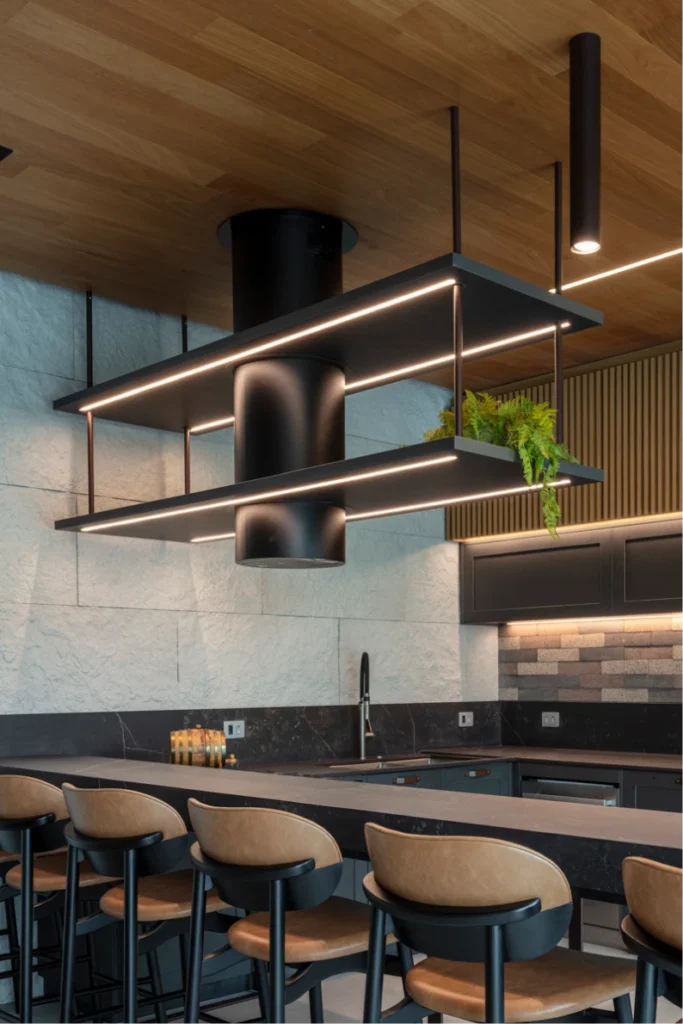 Para equilibrar os volumes, o armário superior em padrão ripado madeirado cria uma separação discreta e elegante entre os elementos, trazendo textura e acolhimento ao conjunto. A seleção do acabamento do puxador foi pensada com precisão: ele conversa perfeitamente com o pé da bancada, que traz um metal em aço corten, o mesmo acabamento Vecchio Metallo, garantindo unidade e harmonia em todo o projeto.
