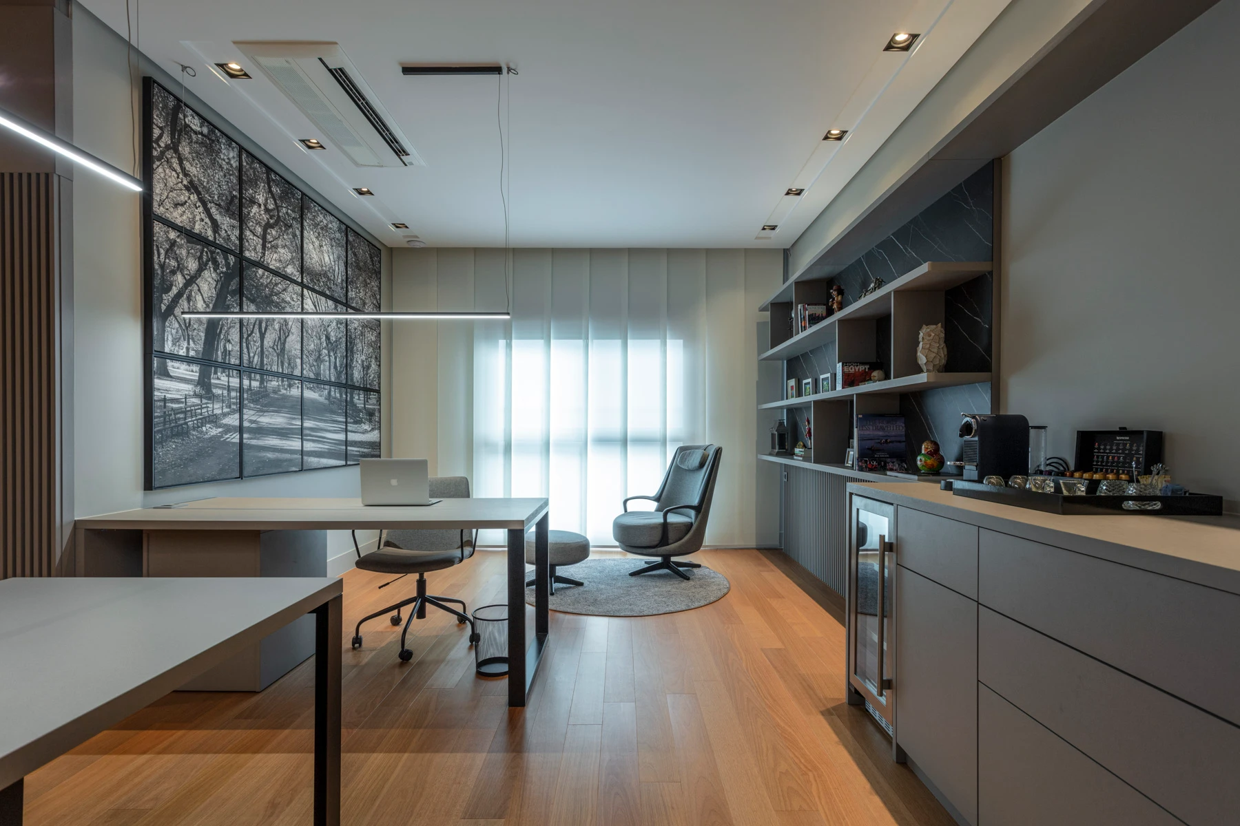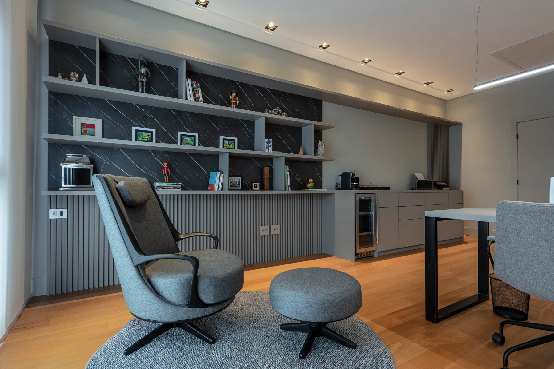 No home office, o objetivo foi desenvolver um ambiente calmo e acolhedor para momentos de trabalho e leitura. O espaço conta com uma poltrona confortável, nichos com fundo em MDF que remete ao mármore — perfeitos para expor memórias e objetos de viagem — e até um cantinho reservado para o café. Duas mesas de trabalho garantem praticidade na rotina.