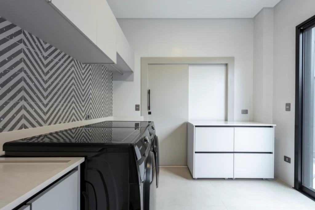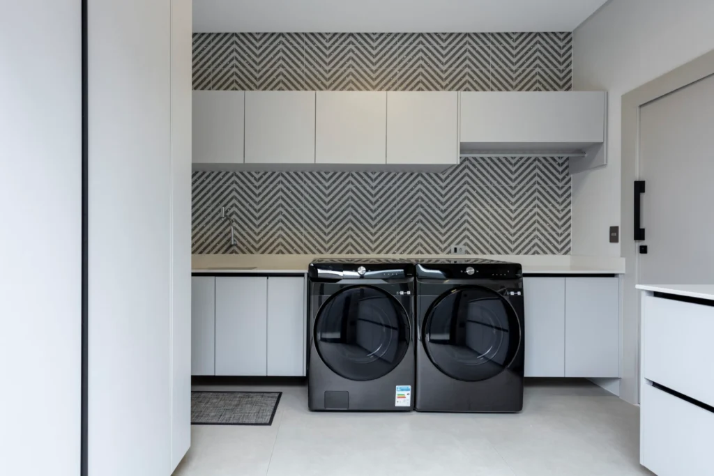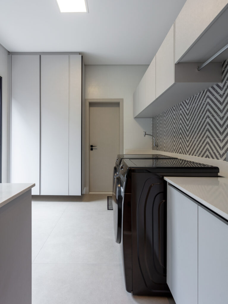 Uma lavanderia funcional, planejada para facilitar a rotina. O ambiente conta com um armário destinado ao armazenamento de vassouras e itens de limpeza, além de um varão instalado na área da pia e das máquinas para pendurar as roupas passadas. Um balcão com rodízio foi projetado para oferecer praticidade e otimizar o uso do espaço no dia a dia.