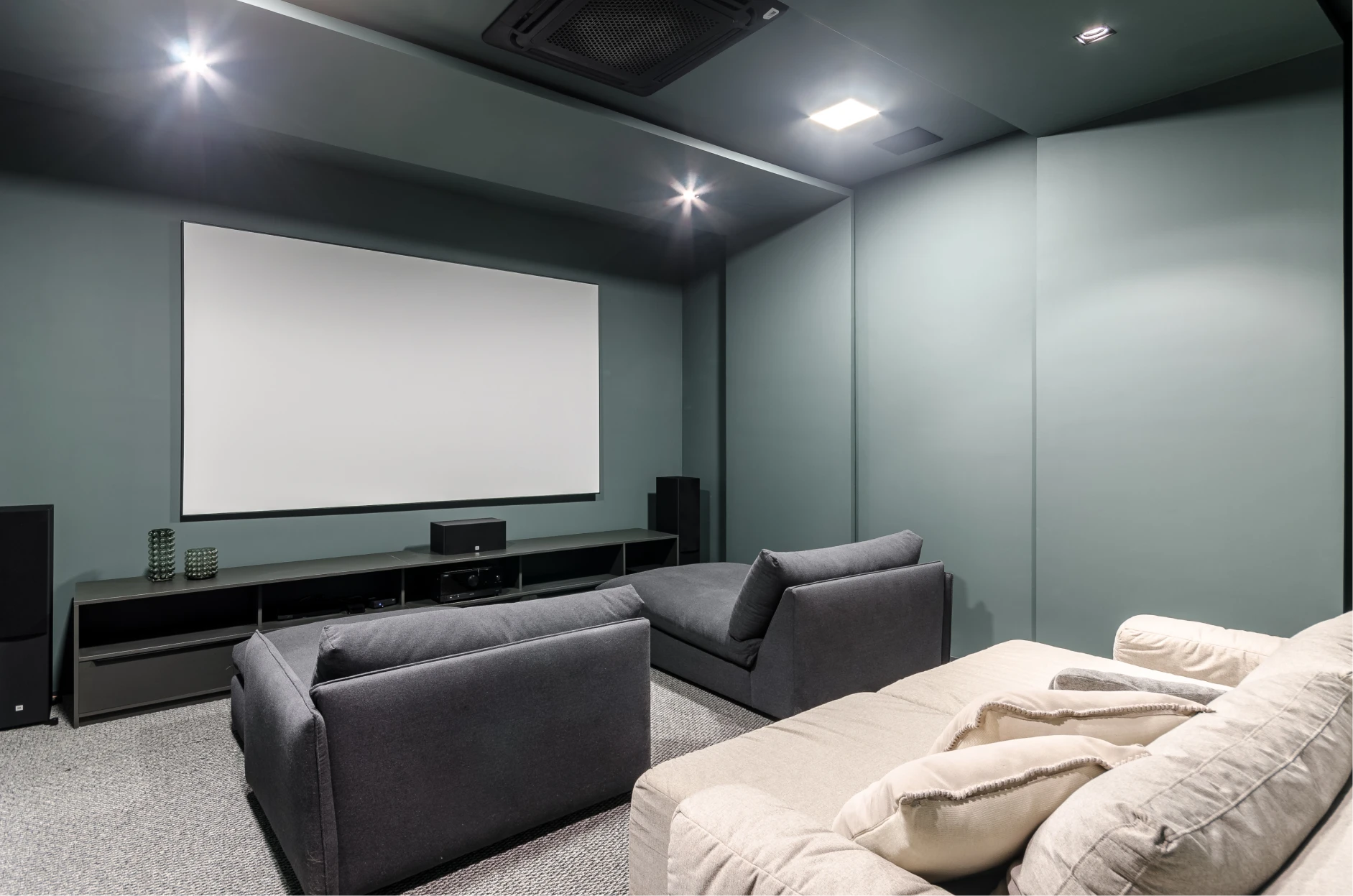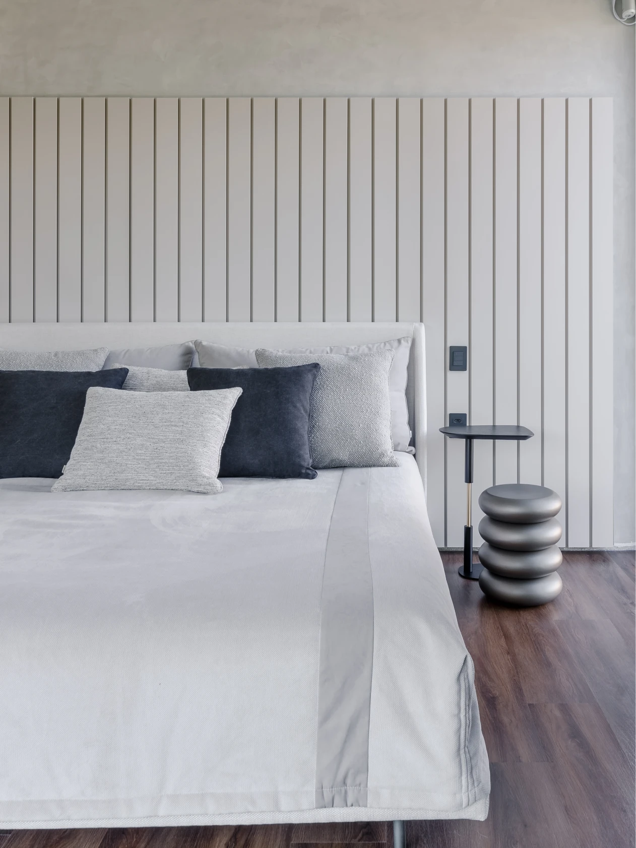 No hall de entrada, painéis em madeira freijó ocultam portas de serviço, preservando a linearidade e garantindo continuidade visual. A escolha da madeira, com seu tom caloroso, acolhe moradores e visitantes desde o primeiro momento. Na área gourmet, um cubo branco delimita sutilmente o home theater, enquanto um ripado espaçado em MDF branco adiciona textura e ritmo sem comprometer a leveza. O gesto simples carrega sofisticação e revela a atenção aos detalhes que permeiam toda a residência.