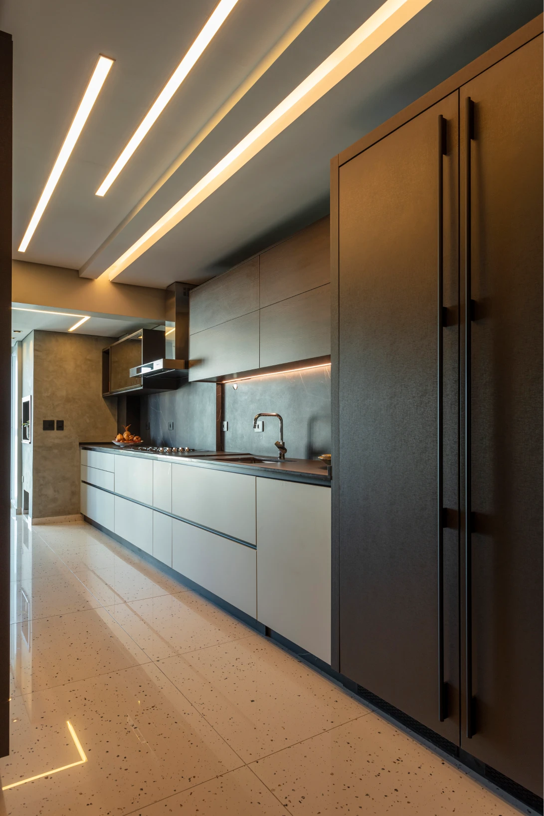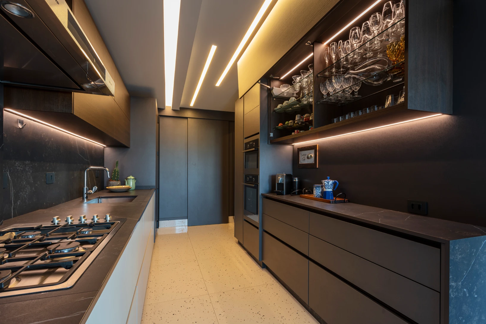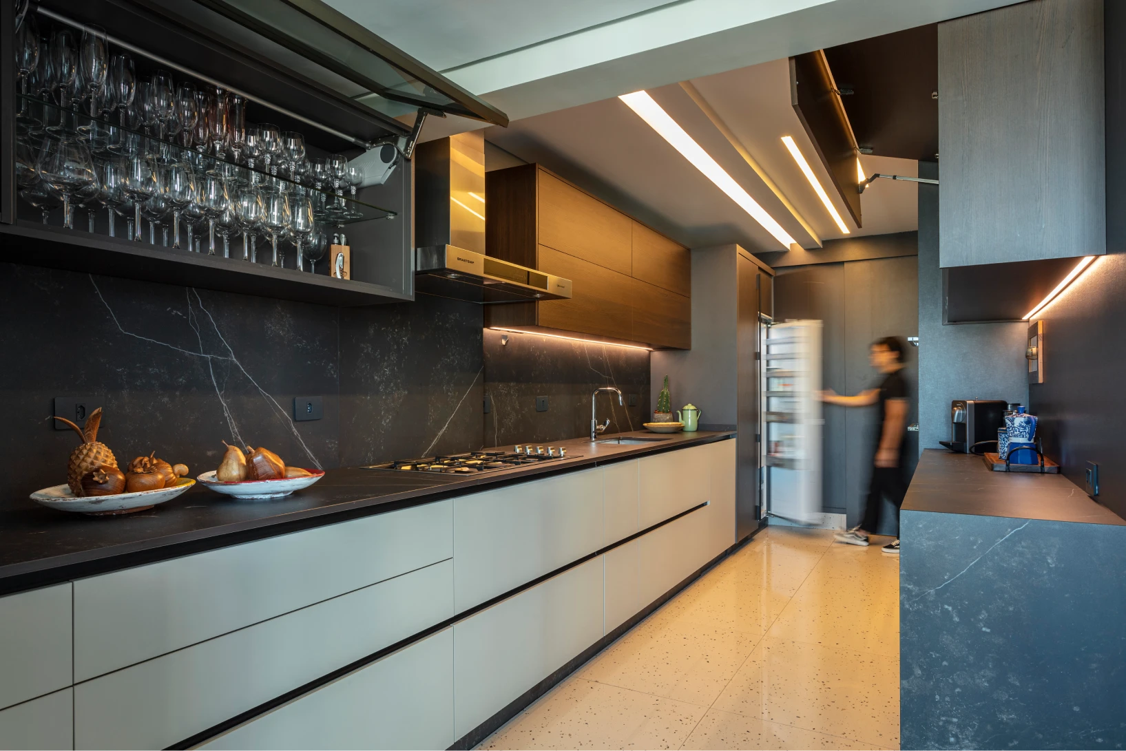 A escolha dos materiais e acabamentos foi feita com tranquilidade. A moradora já sabia exatamente o que queria: tons escuros para equilibrar a iluminação natural do apartamento, que recebe sol até o meio do dia. “Optei por cores fechadas para criar uma atmosfera mais acolhedora ao longo do dia”, diz a cliente do projeto. Esse cuidado com a ambiência guiou todas as decisões, do layout ao acabamento, respeitando a rotina e o desejo por sofisticação sem excessos.