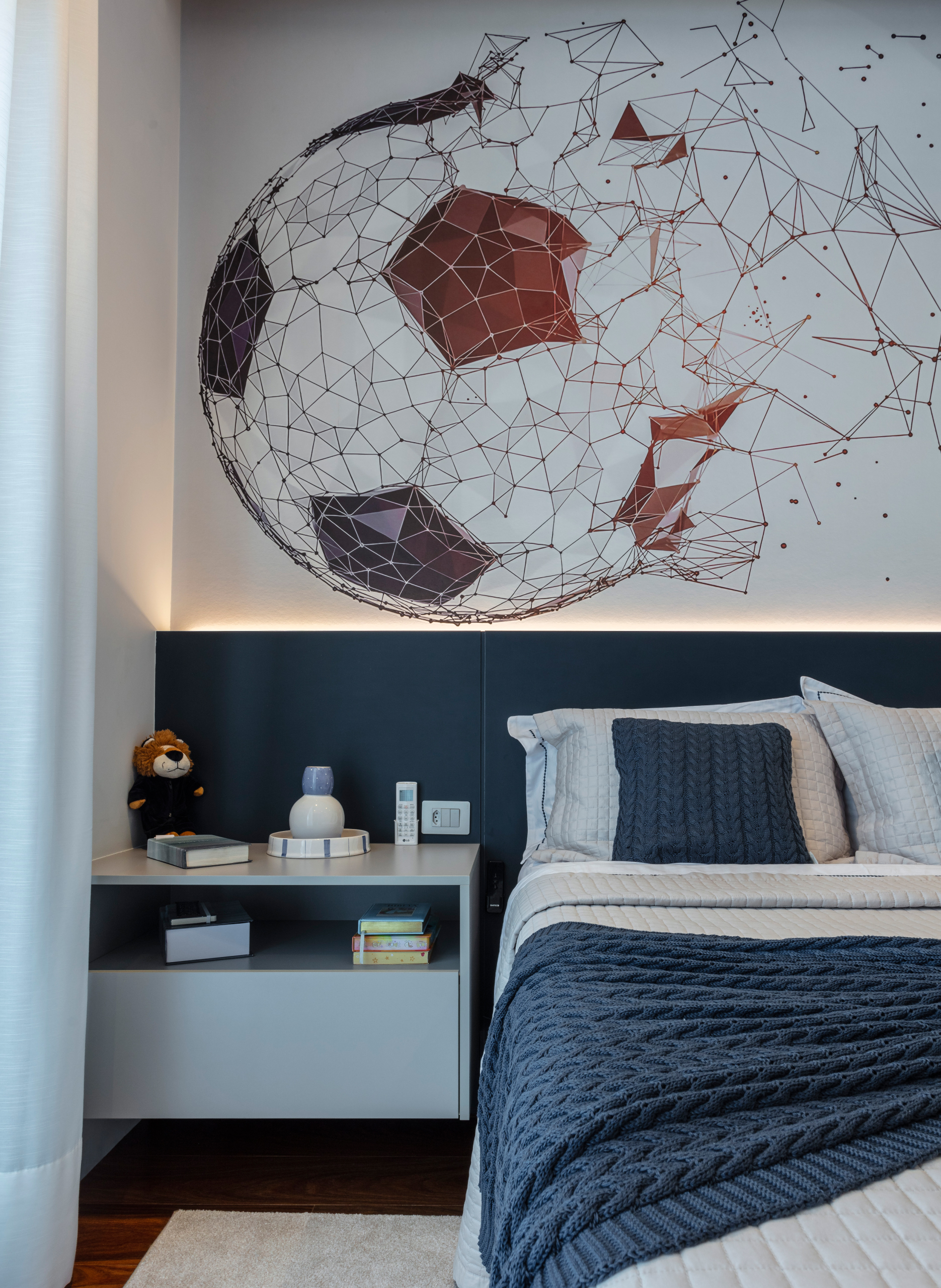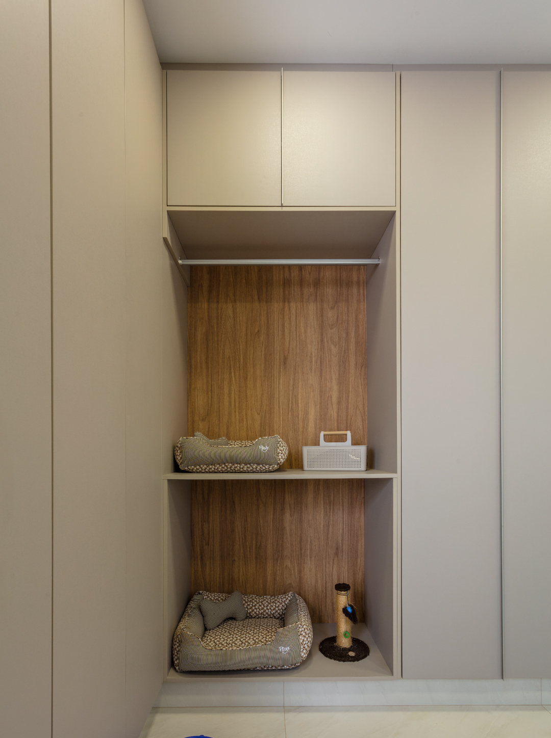 As soluções personalizadas também revelam cuidado com detalhes que vão além da estética. A lavanderia recebeu um cantinho pet discreto, que integra funcionalidade e carinho em um mesmo espaço, mostrando que cada ambiente foi pensado de forma sensível e adaptada às demandas reais da família. “Cada cantinho tem a essência da nossa família. Os quartos ficaram com o jeitinho de cada filho e do casal, e o aconchego dos painéis de madeira é exatamente o que imaginávamos”, relata a cliente, reforçando a dimensão afetiva do resultado.