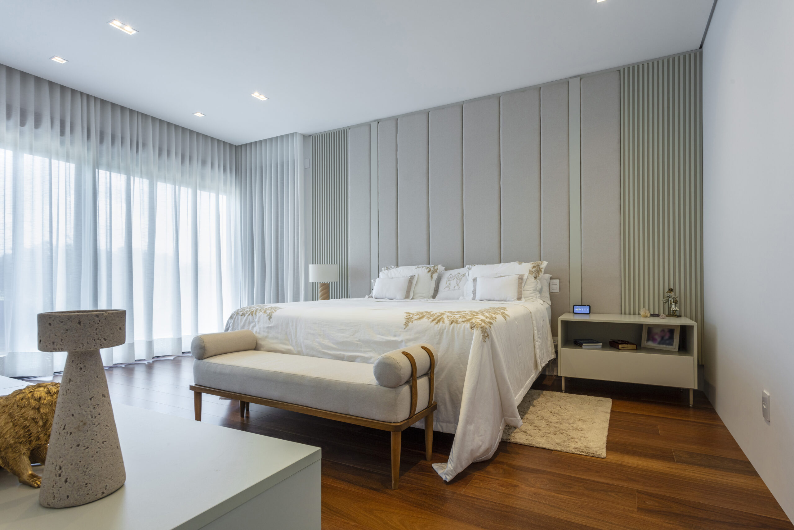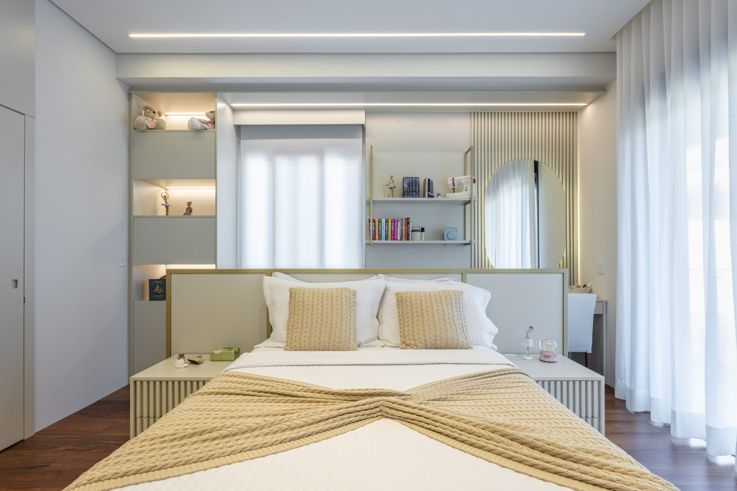 Entre os elementos que mais chamam a atenção, está a cabeceira central no dormitório da bailarina, composta por serralheria dourada e MDF, que equilibra modernidade e delicadeza. O home office, posicionado para valorizar a vista da represa, alia ergonomia, estética e conforto, tornando o trabalho em casa mais agradável e produtivo, além de trazer bem-estar ao cotidiano.