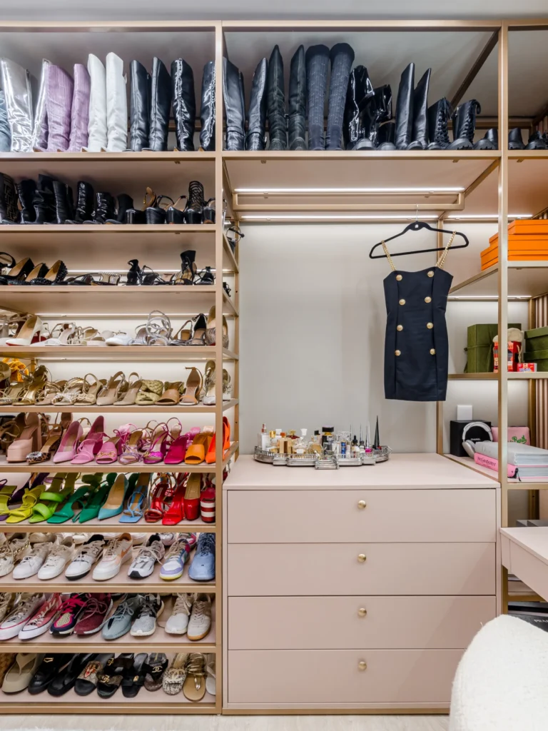 O closet, desenhado sob medida, traduz o equilíbrio perfeito entre funcionalidade e estética. Pensado para atender às necessidades específicas da cliente, cada detalhe foi minuciosamente planejado para garantir organização e conforto. “Cada espaço foi pensado para ser funcional no dia a dia, mas sem abrir mão da estética. O resultado é um ambiente personalizado, prático e com identidade”, destaca Denise.