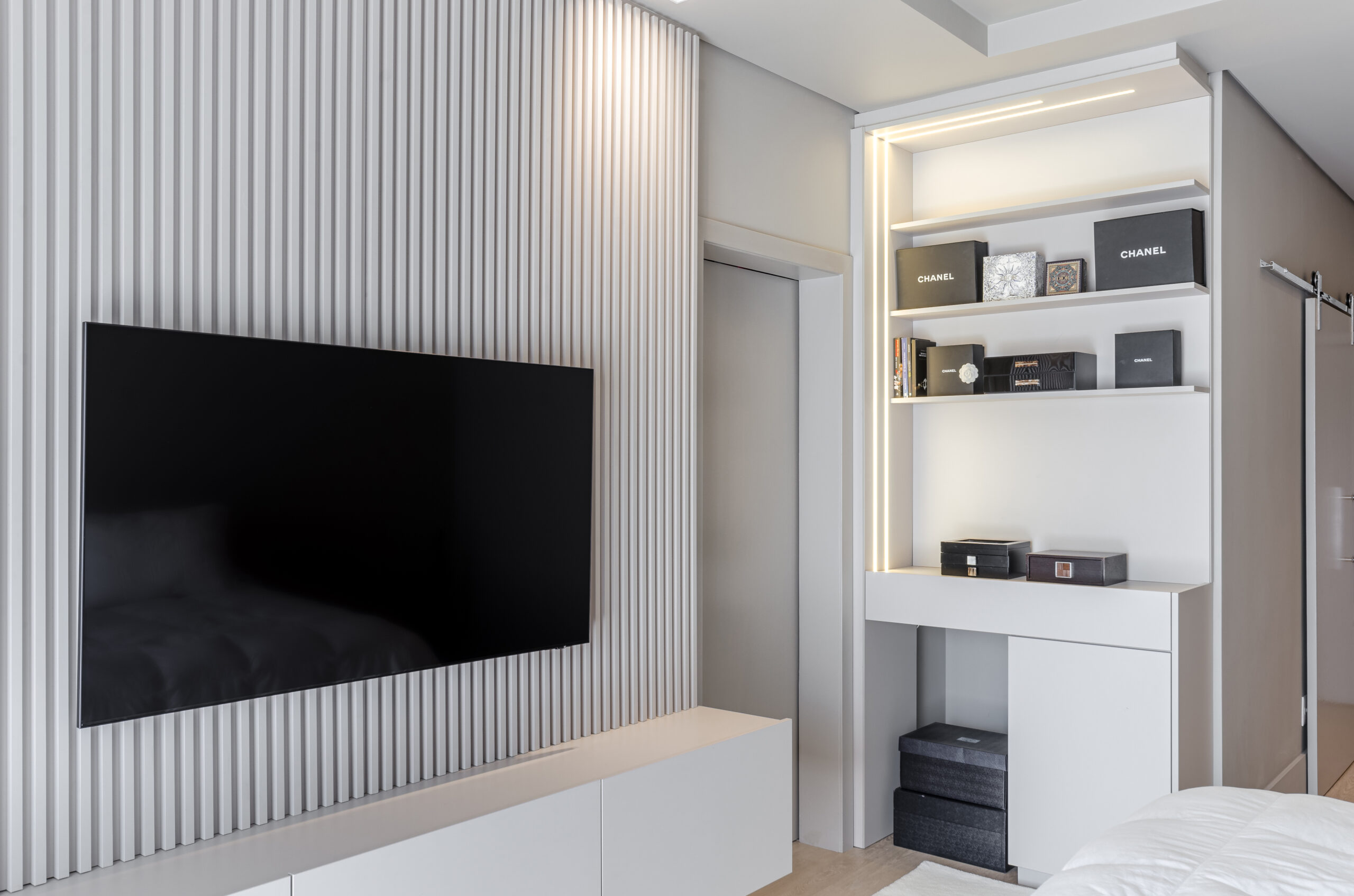 O mobiliário sob medida, executado pela Costa Flores, assumiu papel fundamental na consolidação da linguagem do projeto. Painéis em madeira, armários com abertura fecho-toque e nichos embutidos garantem funcionalidade discreta e estética refinada. Destaque para o painel que oculta a porta de passagem para o home, integrando os espaços com fluidez.“A precisão técnica e o cuidado com os detalhes foram determinantes para alcançarmos o resultado desejado”, destaca a arquiteta.