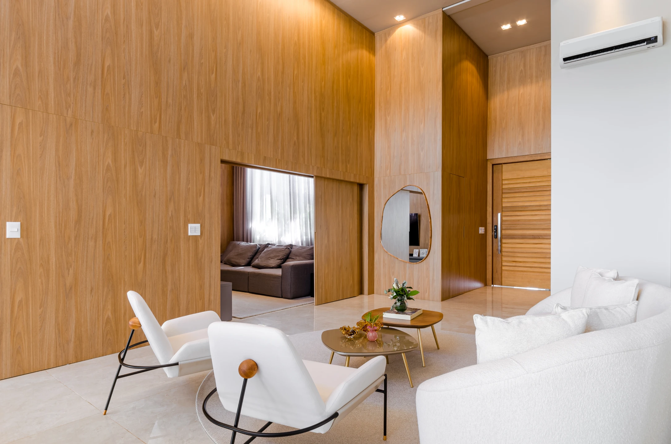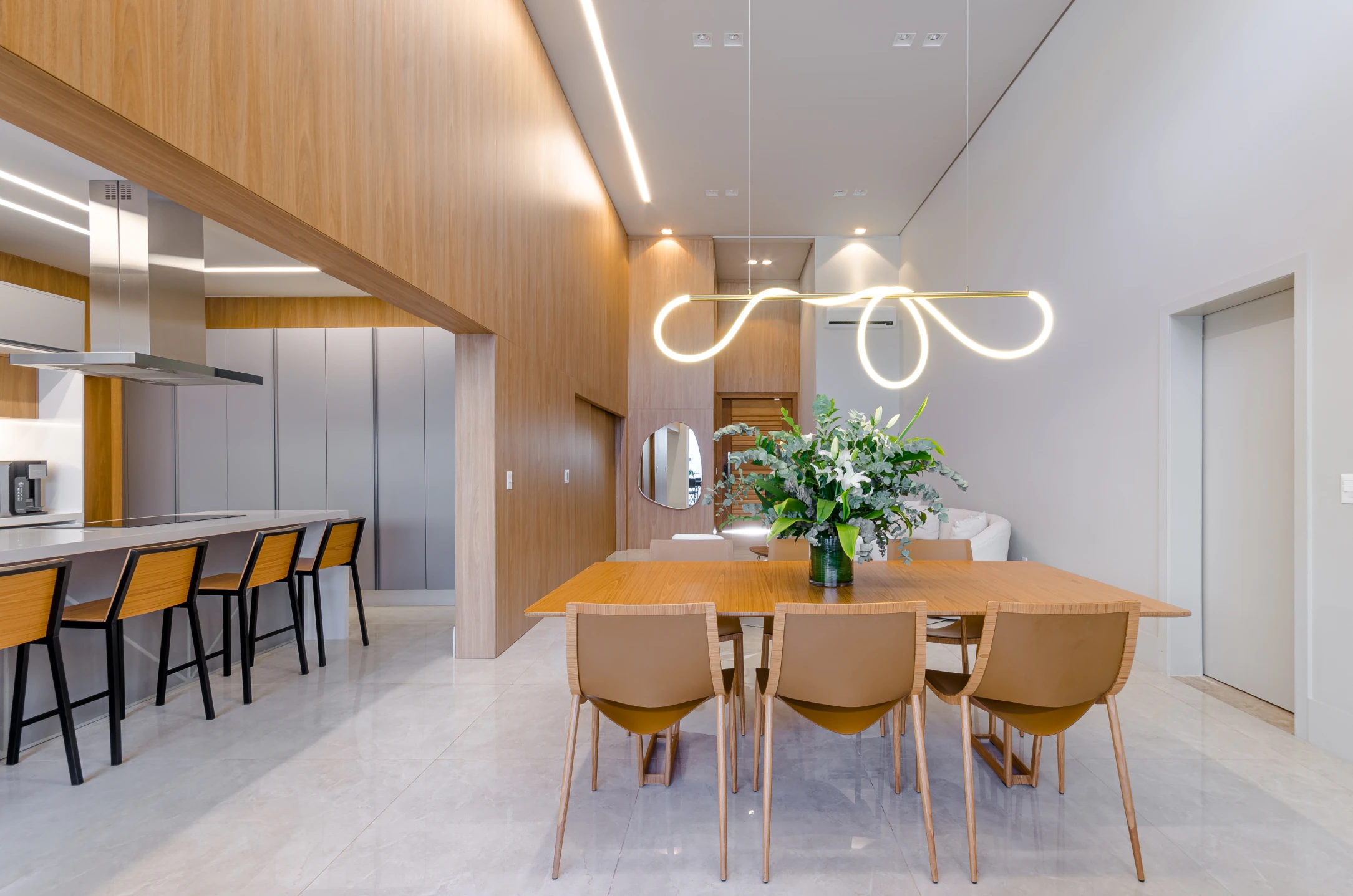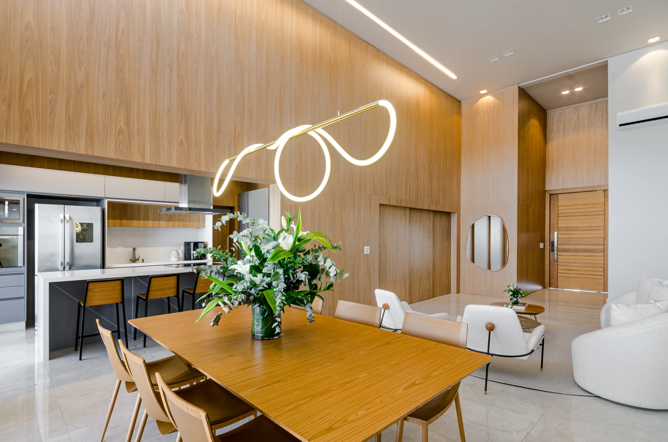 Uma sala de estar com pé-direito duplo, onde a amplitude é valorizada por um painel que se estende até o teto, projetado pela arquiteta Denise Rola para alongar e aquecer visualmente o ambiente. O espaço, generoso e iluminado, integra-se de forma harmoniosa à cozinha, à sala de jantar e ao gourmet, criando uma área social contínua e perfeita para convivência.