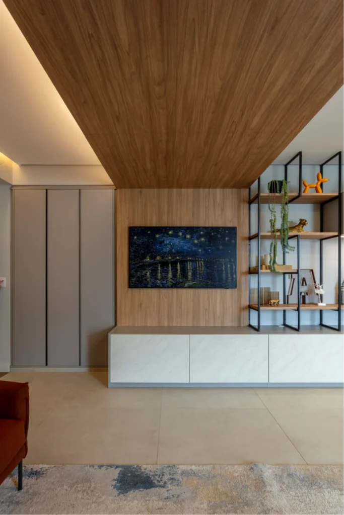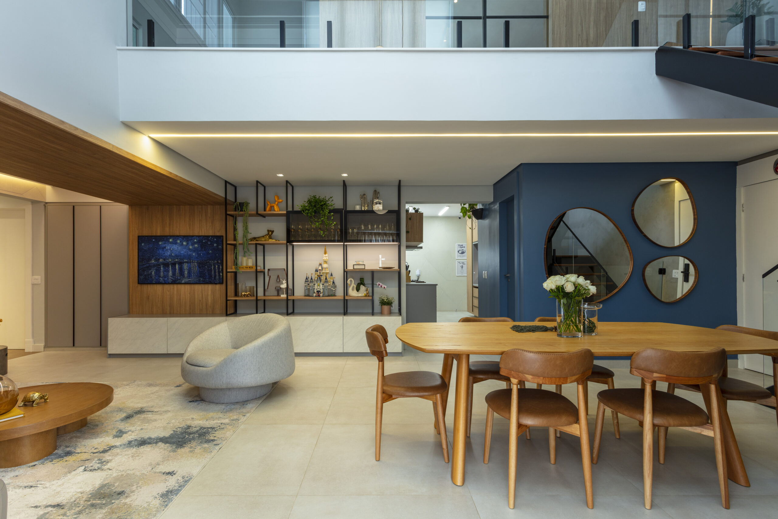 Uma sala ampla que integra a área de TV a sala de jantar em um único ambiente contínuo e convidativo. Na sala de TV, a presença de uma viga foi transformada em solução estética: um painel foi criado a partir dela, descendo pela parede e formando toda a composição do painel da televisão.