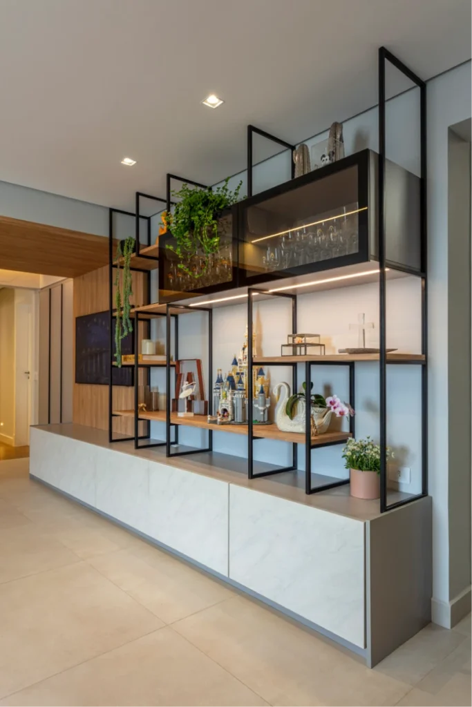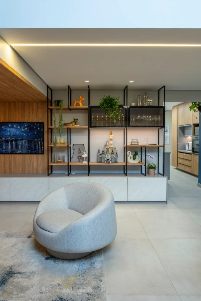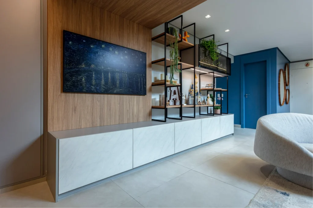 O móvel da TV traz frentes revestidas em pedra, conferindo sofisticação e textura ao conjunto. Sobre ele, uma estrutura em metalon com prateleiras para decoração e dois armários com portas de vidro adiciona leveza e modernidade ao espaço. O contraste entre o peso da pedra e a delicadeza da estrutura metálica resulta em um mobiliário equilibrado, elegante e visualmente marcante.