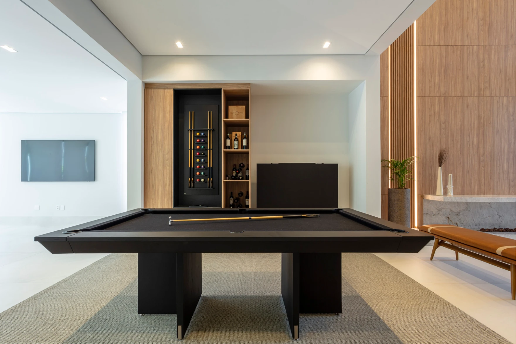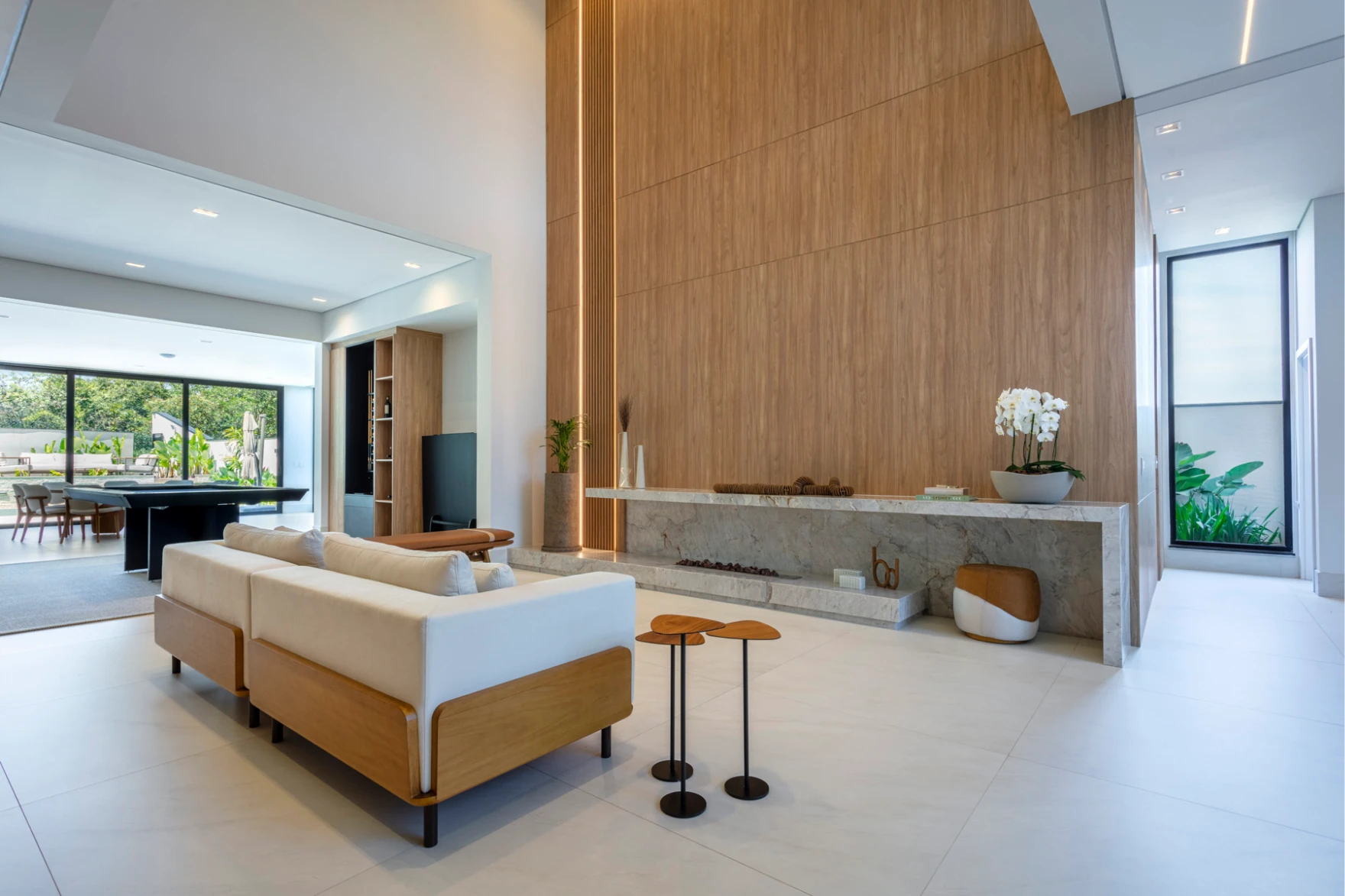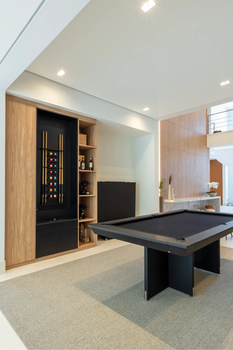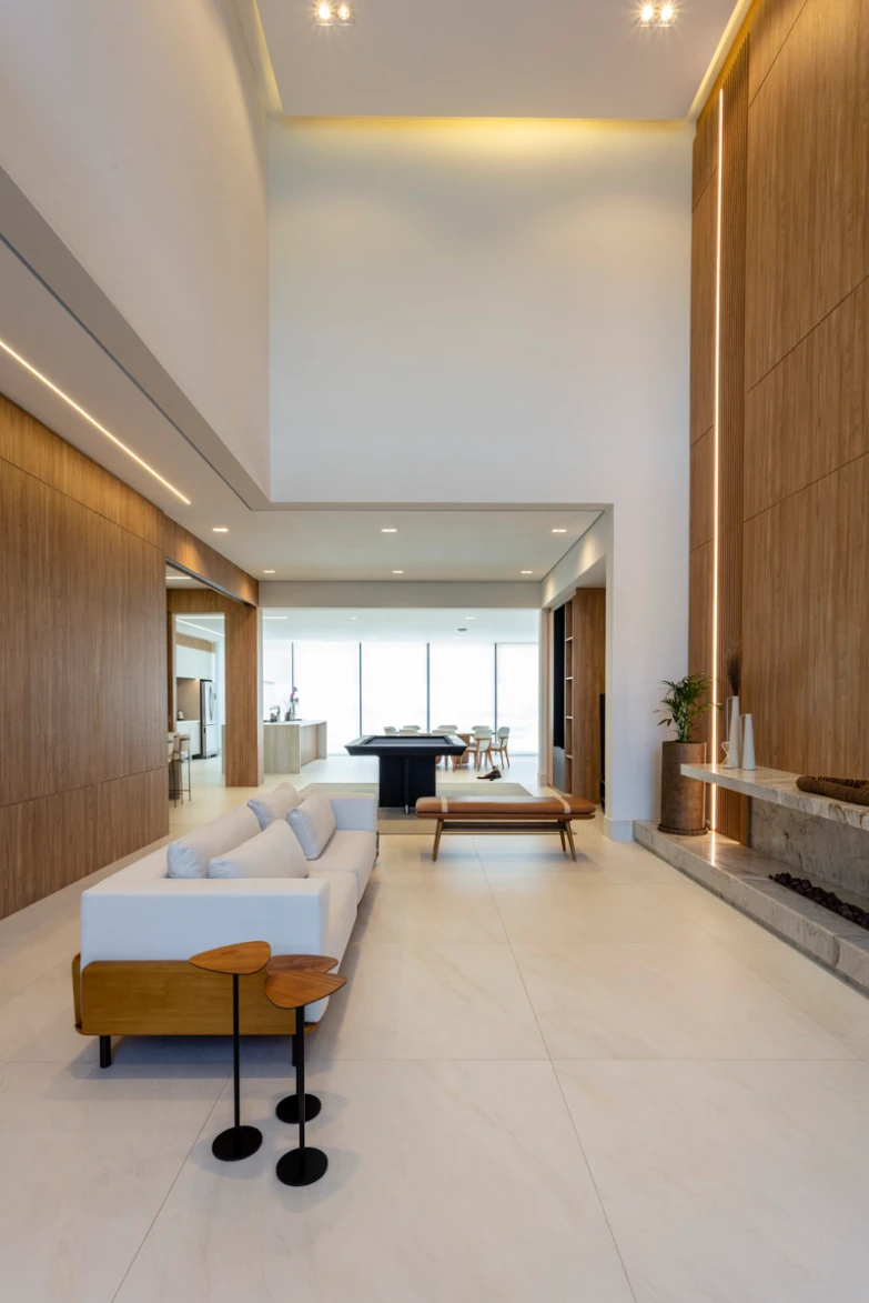Um pé-direito duplo marcado por painéis em madeira que revestem a parede do chão ao teto, conferindo grandiosidade e, ao mesmo tempo, um acolhimento imediato ao ambiente. Para resolver as emendas com harmonia visual, foram aplicados três frisos horizontais, criando ritmo e equilíbrio. No lado esquerdo, um detalhe em painel ripado acrescenta volume e textura, enriquecendo a composição com sutileza e sofisticação.